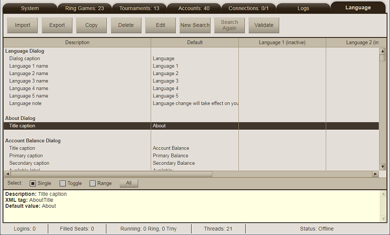Import - Click this button to load a previously saved language file into the specified language column. The values in the file will overwrite the current settings.