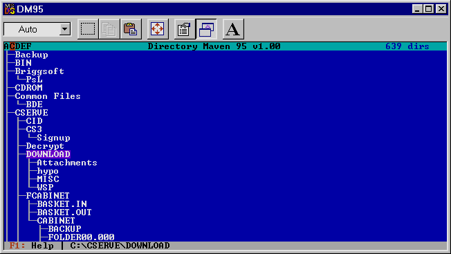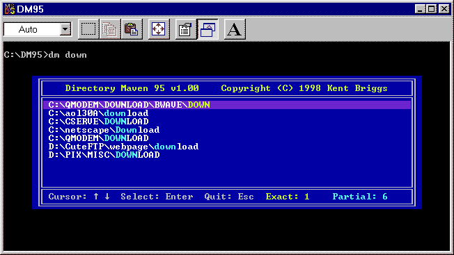 Directory Maven 95 ™ is a freeware automated change directory program. Like the DOS version, you can quickly change to any directory on any drive from the MS-DOS command line or view the directory trees of all your drives. However, Directory Maven 95 is a 32-bit console application that supports long filenames and up to 10,000 directories per drive. Runs on Windows 95 through Vista.