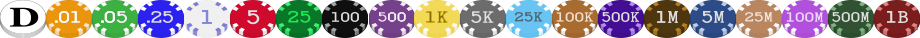 Beginning with version 4, Pro and Gold customers can customize the entire card deck, not just the card back. There are separate images for a two-color deck and a four-color deck. Each image must be exactly 2438 pixels in width by 64 pixels in height, consisting of 52 cards plus the back graphic, each at a width of 46 pixels. From left to right, the cards are in rank order beginning with the deuce of clubs and ending with the ace of spades and the card back at the 53rd position. Within each rank, the suits are ordered alphabetically: clubs, diamonds, hearts, spades. The default decks are displayed below in PNG format: The "Card back graphic" must be exactly 46 by 64 pixels in version 3, with optional transparent corners to give a rounded look. Some samples are provided below in PNG format. The red card is the default image. The "Card back graphic" must be exactly 50 by 70 pixels in version 2, with optional transparent corners to give a rounded look. Some samples are provided below in PNG format. The red card is the default image. The recommended size for poker chips is now 46 x 38 pixels individually, and 920 x 38 as a horizontal sprite with all 20 chips (dealer button plus 19 chip denominations). You can use other sizes as long as you maintain that same aspect ratio. The default chip set is posted below (right-click to save it to your PC). You can use the Image Stitcher utility to create your sprite from individual images. When making your own set, you must maintain the same order of chips you see below so that the amounts match what is printed on the table. Unless of course you remove the denominations, then the order right of the dealer button doesn't matter.