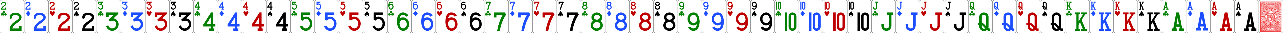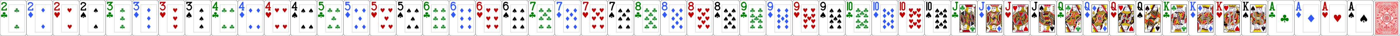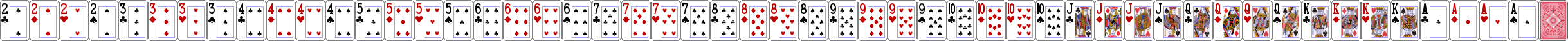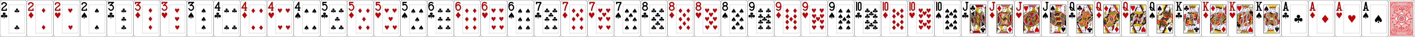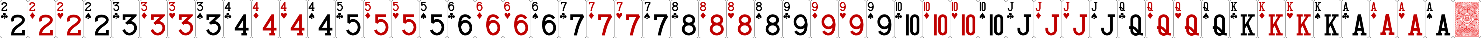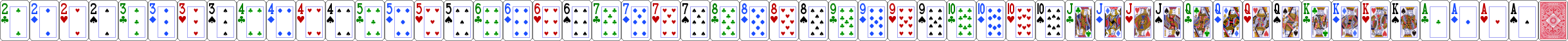 The recommended size for cards is now 92 x 128 pixels individually, and 4876 x 128 as a horizontal sprite with all 52 cards plus the card back. You can use other sizes as long as you maintain that same aspect ratio. The default two-color and four-color decks are below (right-click to save them to your PC). You can use the Image Stitcher utility to create your sprite from individual images. When making your own sets, you must maintain the same order of cards you see below with the back image as the 53rd card.