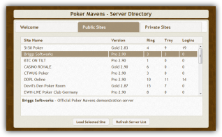 You can see immediately how the Poker Mavens system performs from the players' perspective without installing any software. Simply visit the live server directory at PokerMavens.net, select and load one of the public sites running right now, create an account, and log in.