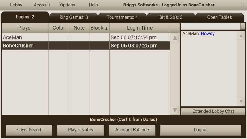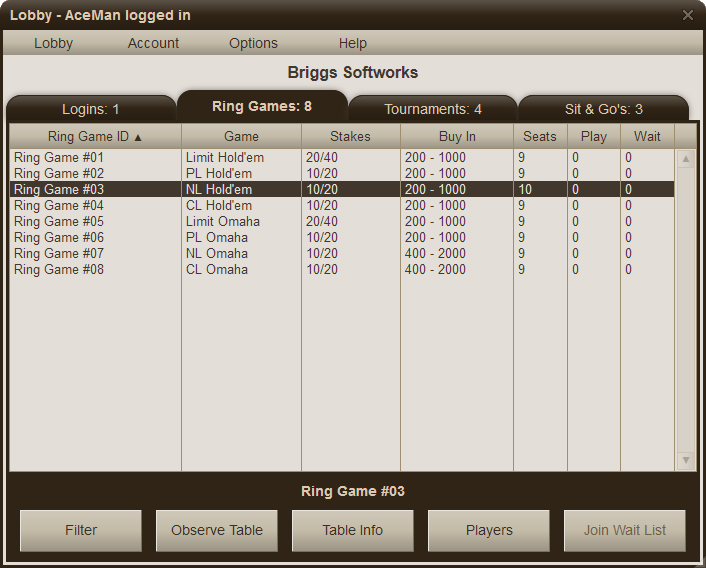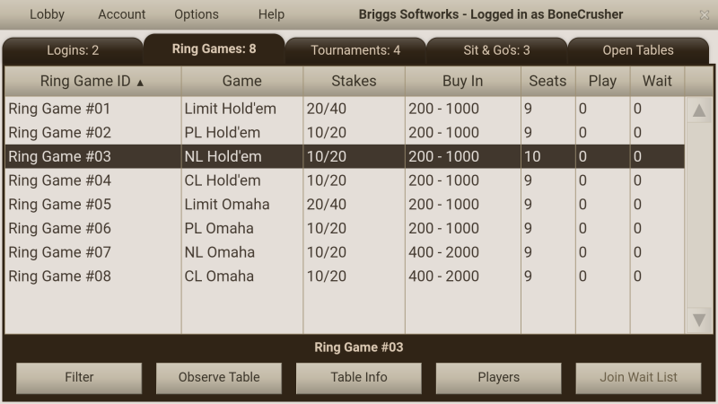 These are screenshots of the client module in desktop mode. Click thumbnail images for a closer view. This is what the players see inside their web browser after connecting to your site. The web interace is available for all popular browsers so Windows, Mac, Linux, iOS, and Android users can all play together.