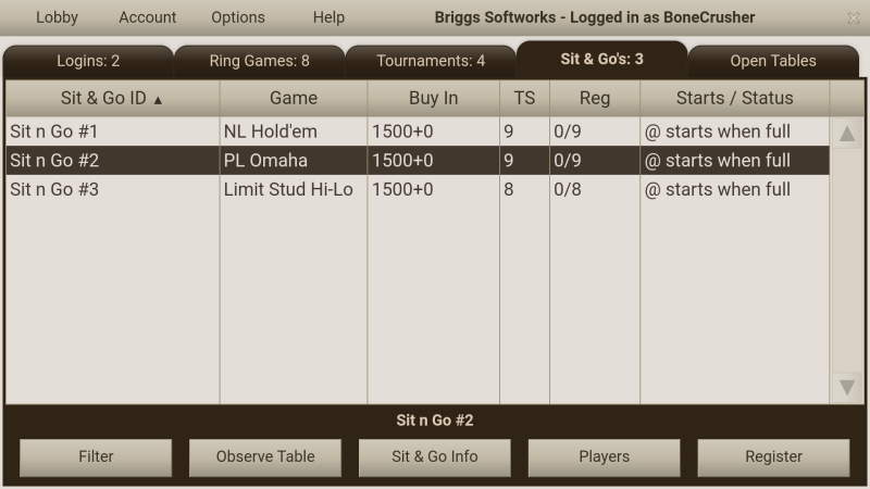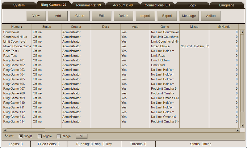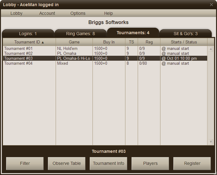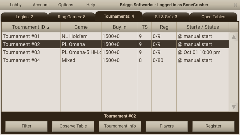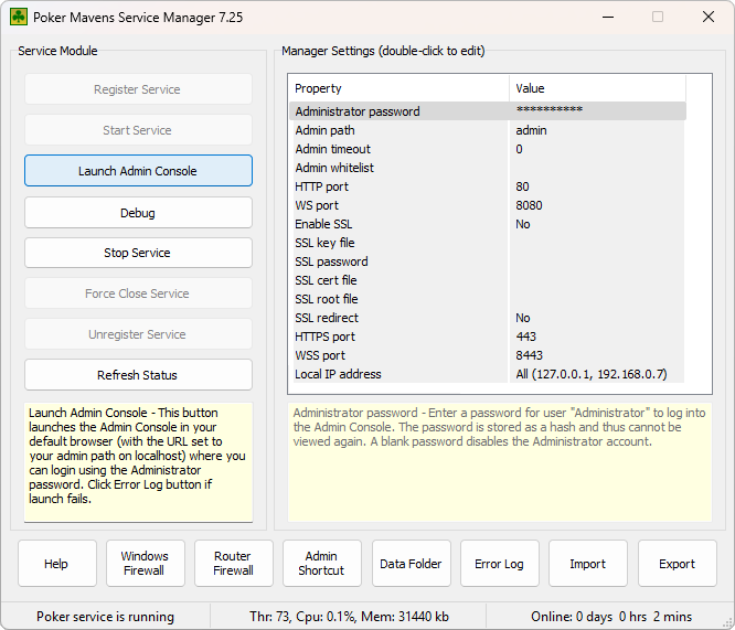 This is a screenshot of the service manager, used to configure and launch the poker server. It runs on any Windows PC (XP and newer) and any Windows Server (2003 and newer). Click thumbnail image for a closer view.
