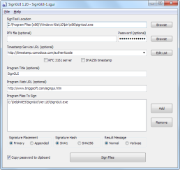 SignGUI is a free graphical front end for Microsoft's SignTool.exe console utility, used by software developers to digitally sign their programs for authentication.