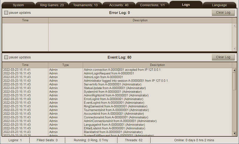 The Logs tab keeps a running list of errors and events that occur while your server is online. The types of events to log and other settings related to these lists are determined by the Log Settings on the System tab. These lists are reset each time the game server is started. However, a copy can also be saved to disk files, as determined in the Log Settings.