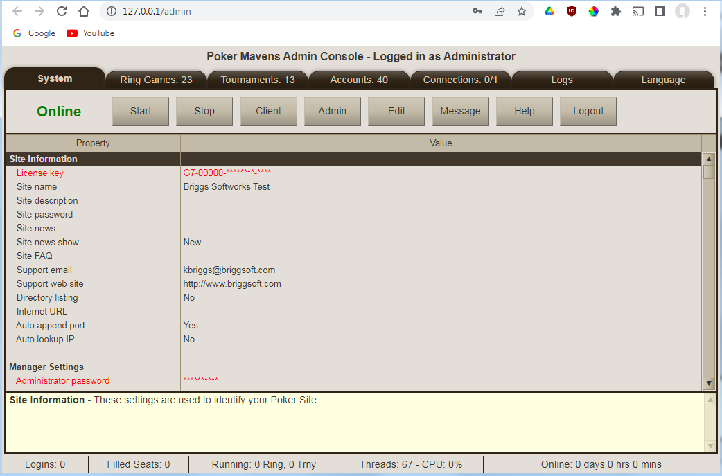 Start - As in previous versions, clicking the Start button puts the poker server online so it can accept player logins (and API connections). After that, you are free to logout from the Admin Console and close the browser since the server will continue to run as a Windows Service. And if you enable the "Auto start server at bootup" setting in the Server Settings group, the poker server will automatically put itself back online after a reboot.