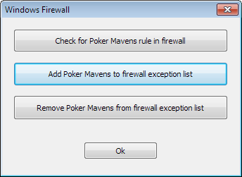 Windows Firewall - Click this button to add Poker Mavens to the Windows Firewall exception list. This is required to allow incoming connections. In previous versions you had to do this manually when running on Windows Server. In the desktop version of Windows, it would prompt you on your first launch. But this no longer happens since the program is no longer a desktop application. So everyone must use this feature.