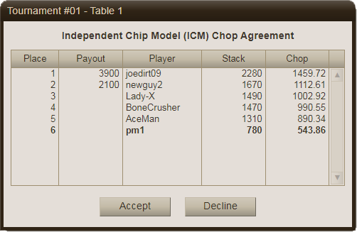 If all players click the Accept button before the allotted time expires (as determined by your "Player chop seconds" setting in the Client Settings group) then the tournament will end immediately with each player receiving the applicable amount of chips shown in the Chop column (in addition to their own bounty in a bounty tournament). Otherwise, the tournament continues on if there is not unanimous acceptance. If all players keep their chop box checked, the tournament will continue to pause before each hand and present the updated chop agreement based on the current stack sizes.