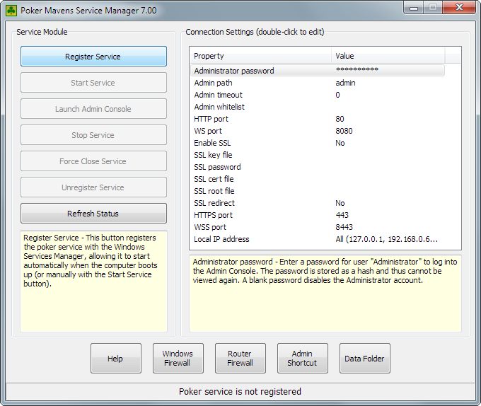 To start the poker service, first click the Register Service button. This registers the program with the Windows Service Manager, allowing it to be started and to also start automatically on the next bootup (unless you unregister it before then). Then click the Start Service to run the program. You won't actually see anything at this point because there is no user interface for a service program. But the service will be running and accepting admin connections. It will not accept player or API connections at this point, however. You must put the server "online" with the Start button in the Admin Console as you did in previous versions.