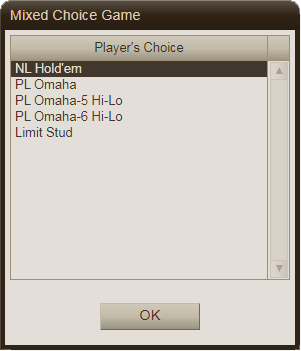 Mixed Choice (Lite/Pro/Gold) - This new Game type option allows ring game players to choose which game to play next, from the selection determined by the Mixed field. The selecting player will get a popup dialog like this: