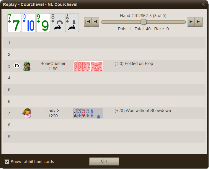 Here you can see that the hand ended on the flop but would have dealt an [8s] on the turn and a [As] on the river had it gone that far. Who likes the bunny icons? :)