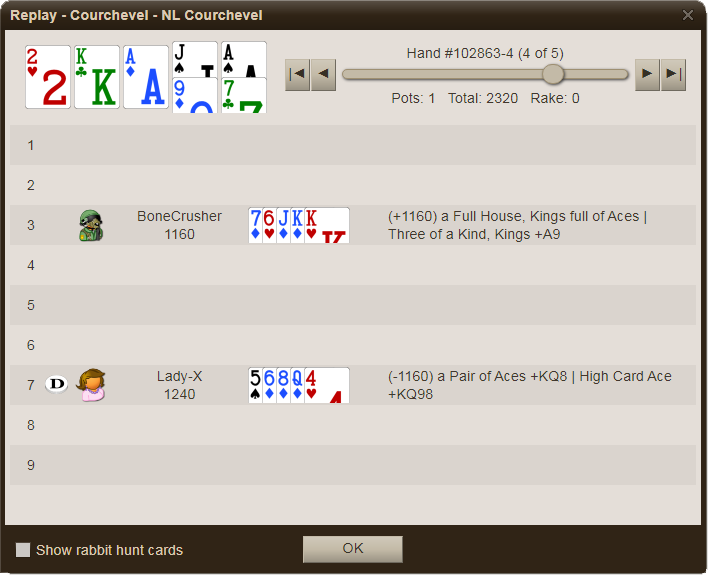 In addition to Courchevel, the Pro and Gold editions have one more exclusive feature that allows players to see which community cards would have been dealt if the hand had gone all the way to the river. These "rabbit hunt" cards are not shown on the table but are shown in the new graphical replay summary dialog that is described below. This feature only applies to community card games (not Stud or Razz).