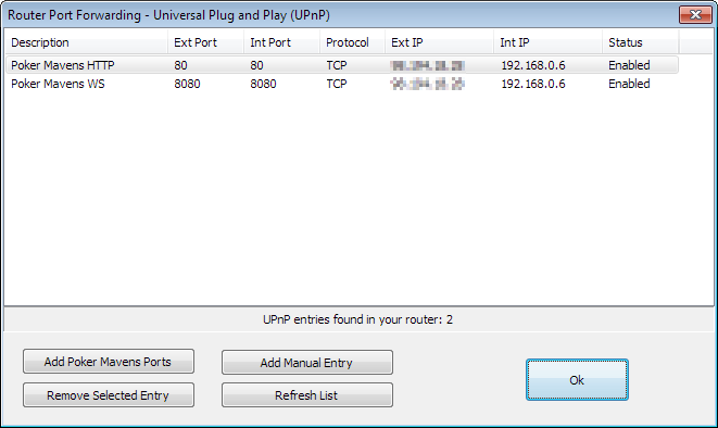 Note that if you already have ports open in your router for Poker Mavens, they likely will not show here. That is because most routers keep manual entries separate from the ones entered via UPnP. Use one method or the other, but not both. You may also see other entries not related to Poker Mavens. Do not delete those unless you are certain they are no longer needed (e.g., you deleted the app that made them, etc.). When installing Poker Mavens on a remote hosting site you likely do not have routers involved so port forwarding will not be an issue for you.