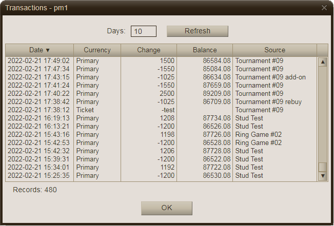 Version 7 now records all chip and ticket transactions in a database that players can query directly from the client. They do this by selecting "Show balance" from the Lobby Account menu and then clicking the new Transactions button: